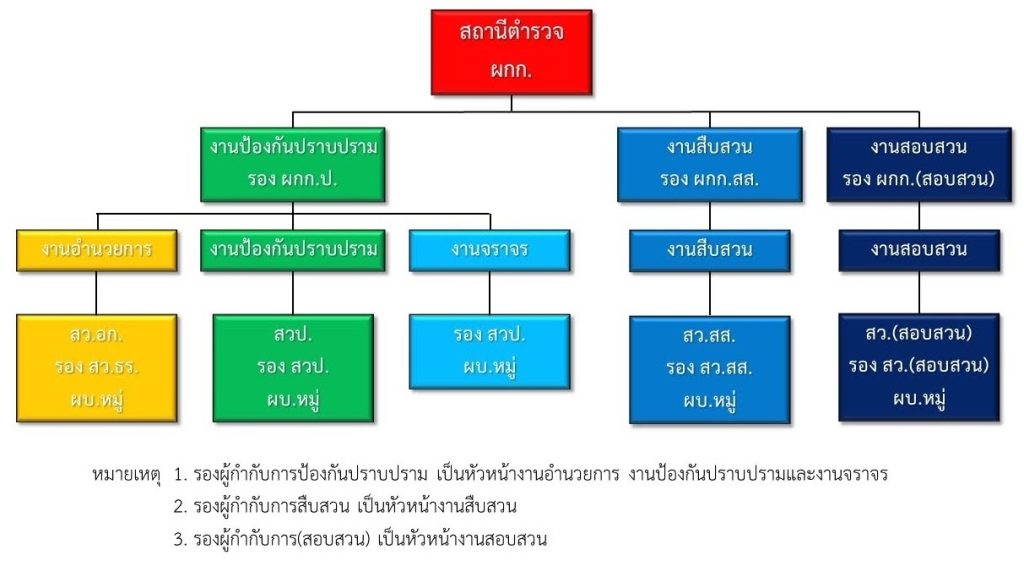 มีหน้าที่เกี่ยวกับการอำนวยการ การวางแผน การตรวจสอบติดตามและประเมินผลงานที่เกี่ยวกับนโยบาย ยุทธศาสตร์ และแผนงานของสถานีตำรวจ งานการบริหารบุคลากร งานจเรตำรวจ งานกิจการพิเศษ งานความมั่นคง การศึกษาการฝึกอบรม งานวิชาการ สวัสดิการ การพัฒนา การบริหารจัดการ งบประมาณ การเงิน การพัสดุ การพลาธิการและ สรรพวุธ การส่งกำลังบำรุง รวมทั้งลักษณะงานอื่นๆ ที่เกี่ยวข้องหรือเป็นส่วนประกอบของงานดังกล่าว เพื่อส่งเสริมหรือสนับสนุนการปฏิบัติงานของสถานีตำรวจ